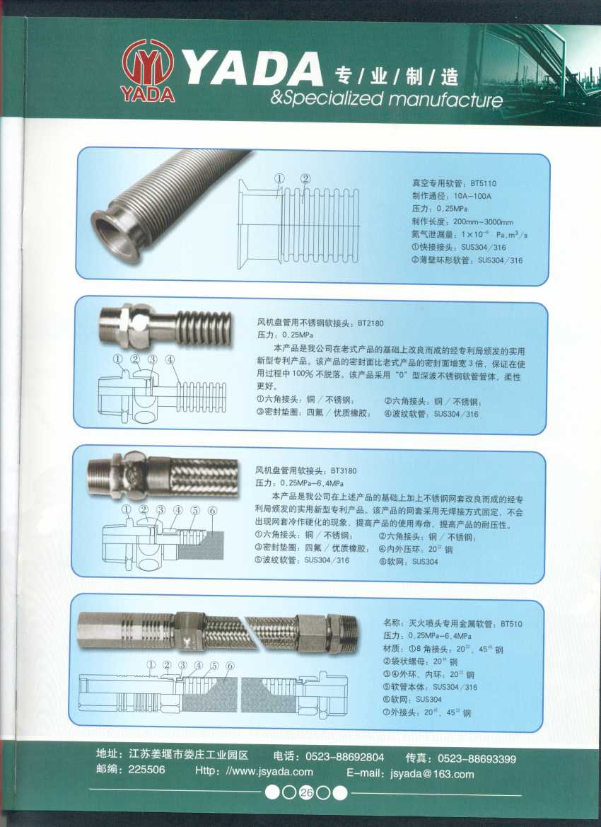 秉天時(shí) 籍地利 仰人和 虔誠(chéng)一個(gè)永恒的理念,創(chuàng)新永續(xù).百諾不如一信,亞達(dá)人堅(jiān)持以信為本,視客戶如同上帝,把對(duì)信譽(yù)的追求,體現(xiàn)在嚴(yán)格的質(zhì)量控制和完善的客戶服務(wù)上,讓客戶百分之百滿意是亞達(dá)人不變的信念。 本廠系ISO9001質(zhì)量認(rèn)證企業(yè)、計(jì)量合格企業(yè)。本廠專業(yè)致力于生產(chǎn)不銹鋼金屬波紋軟管、超高壓、高壓膠管、波紋管補(bǔ)償器(膨脹節(jié))、立式、臥式、冷卻器。本廠產(chǎn)品具有承受壓力高、彎曲半徑小、抗疲勞性能強(qiáng)、使用壽命長(zhǎng)等特點(diǎn)。廣泛應(yīng)用于電力、石化、冶金、水泥建材、工程機(jī)械、礦山及液壓系統(tǒng)。產(chǎn)品暢銷(xiāo)全國(guó)各地。 今日亞達(dá)之成功源自諸多客戶的厚愛(ài),明天的輝煌更離不開(kāi)您對(duì)我的支持與信賴。查看更多>>